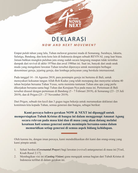 Pertemuan Now and Next Movement perdana dilakukan di Bali pada 14-16 Agustus 2018 untuk mensyukuri penyertaan Tuhan selama 40 tahun.